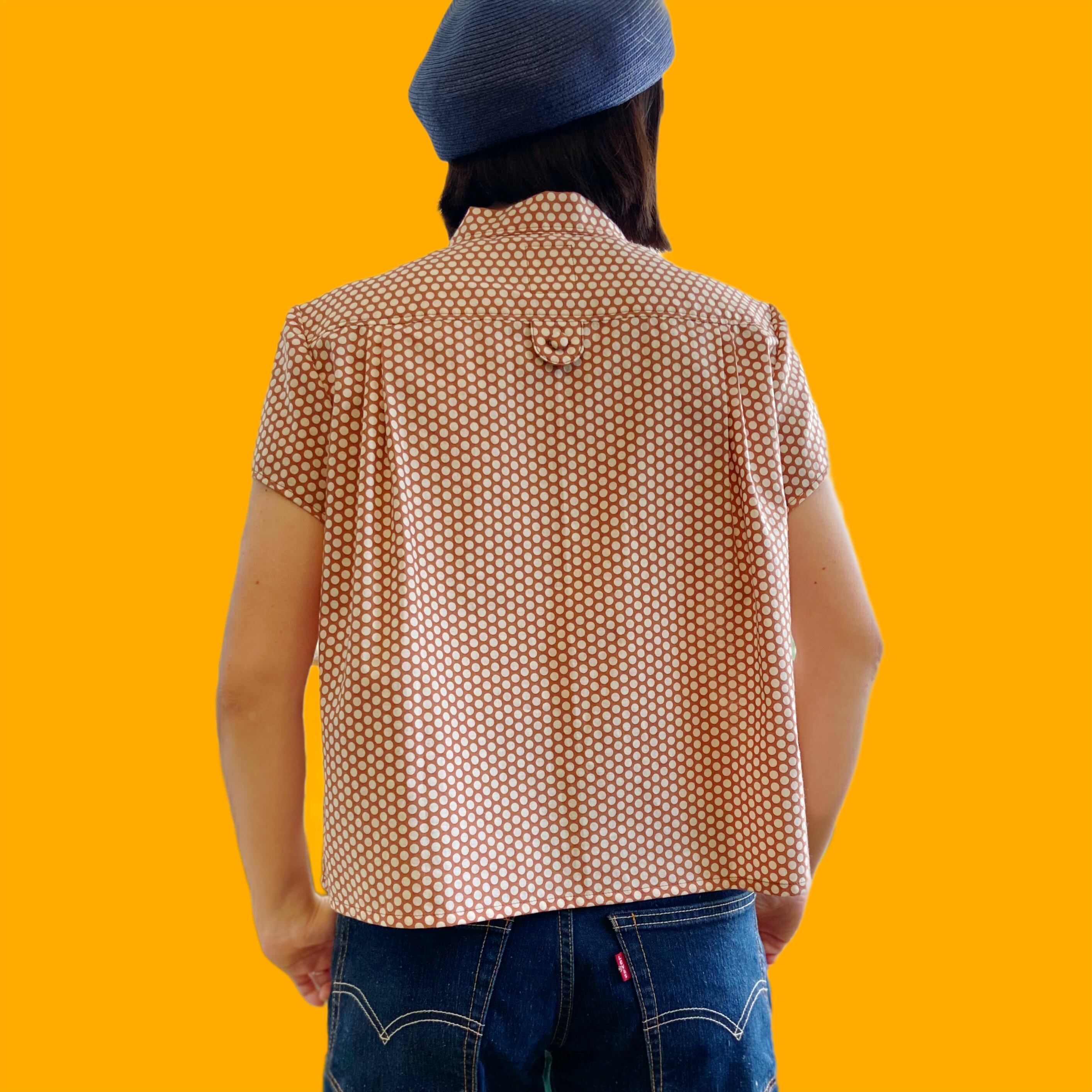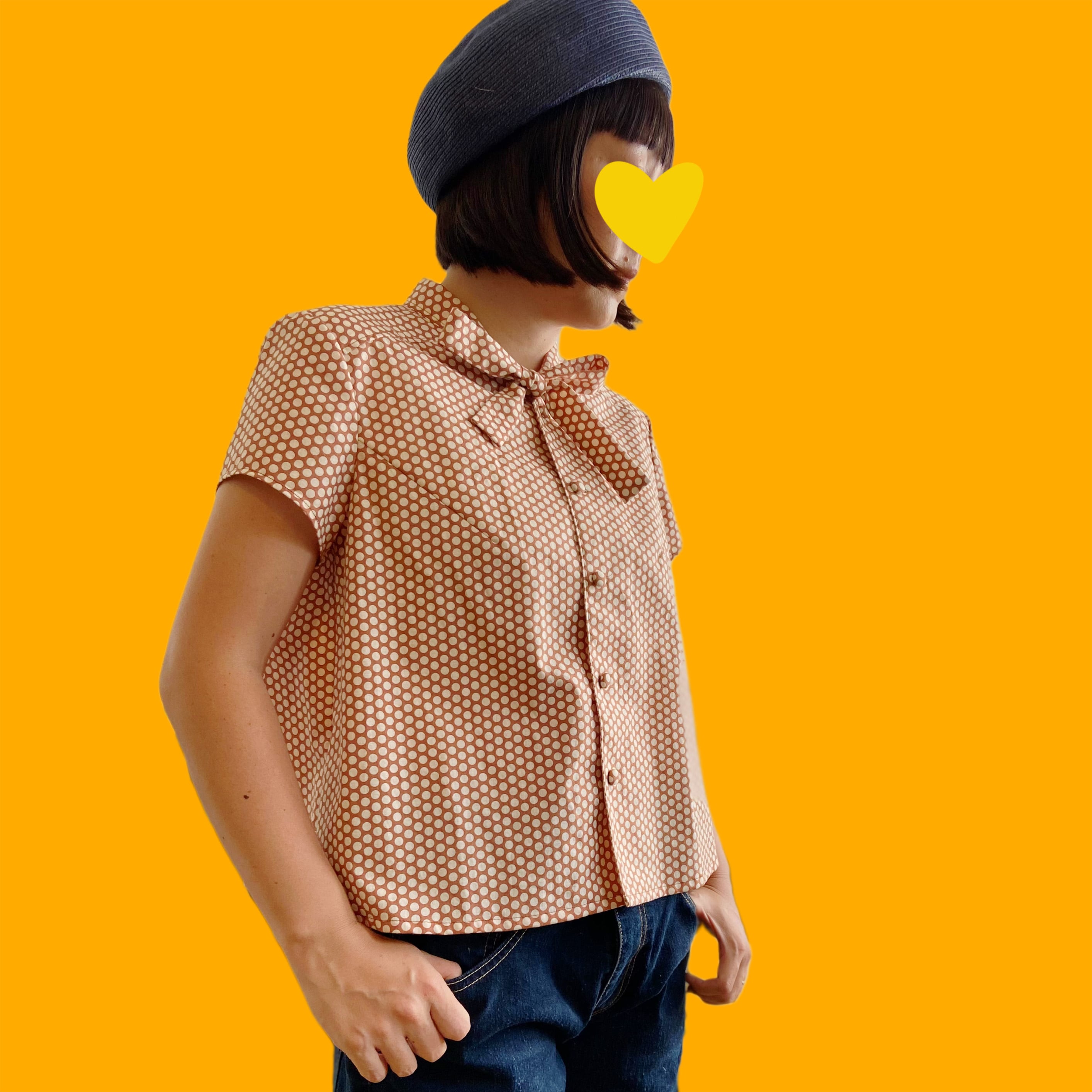 ボーカラーと共布のボタンと背中のプチタブが特徴の、シンプルながら個性的なブラウス。