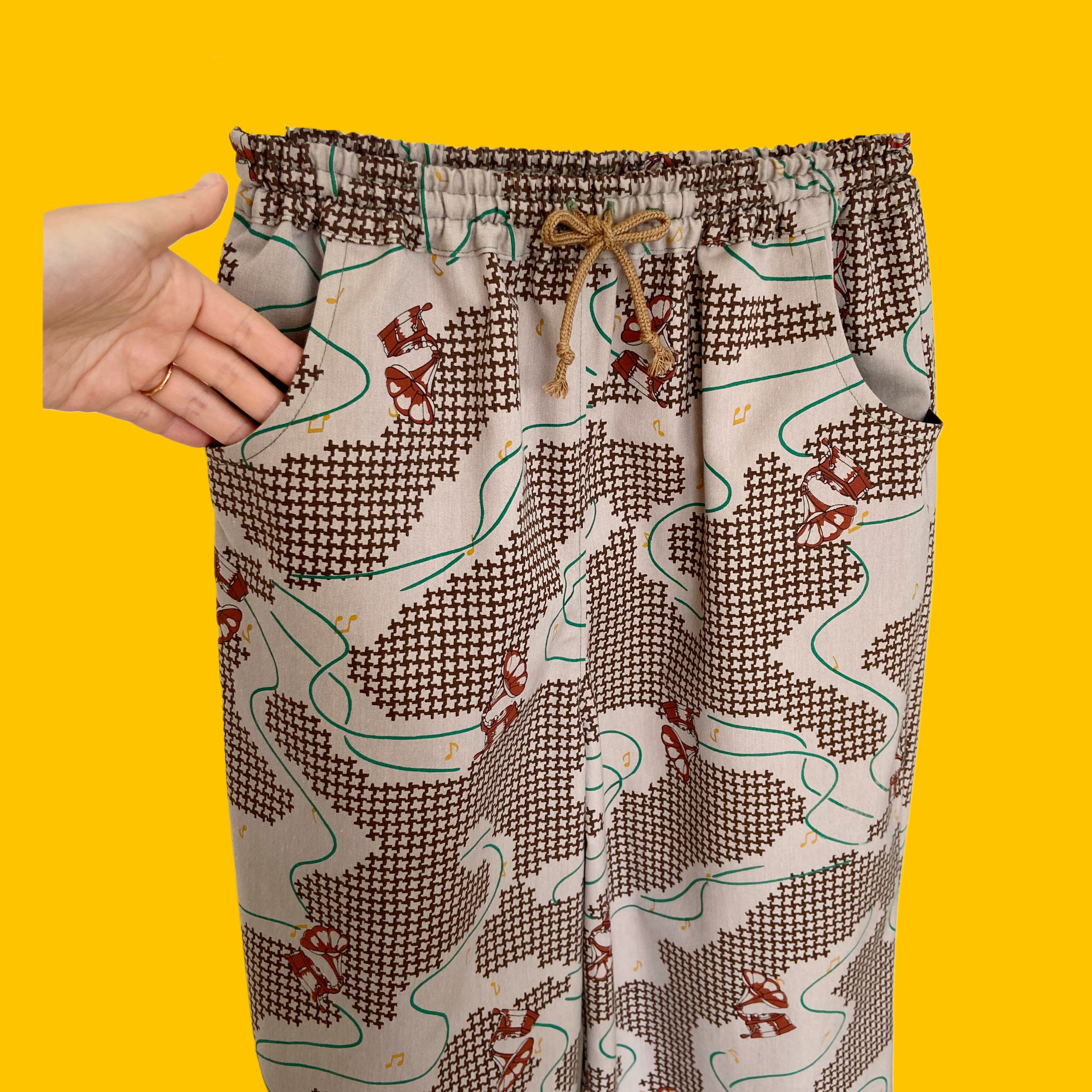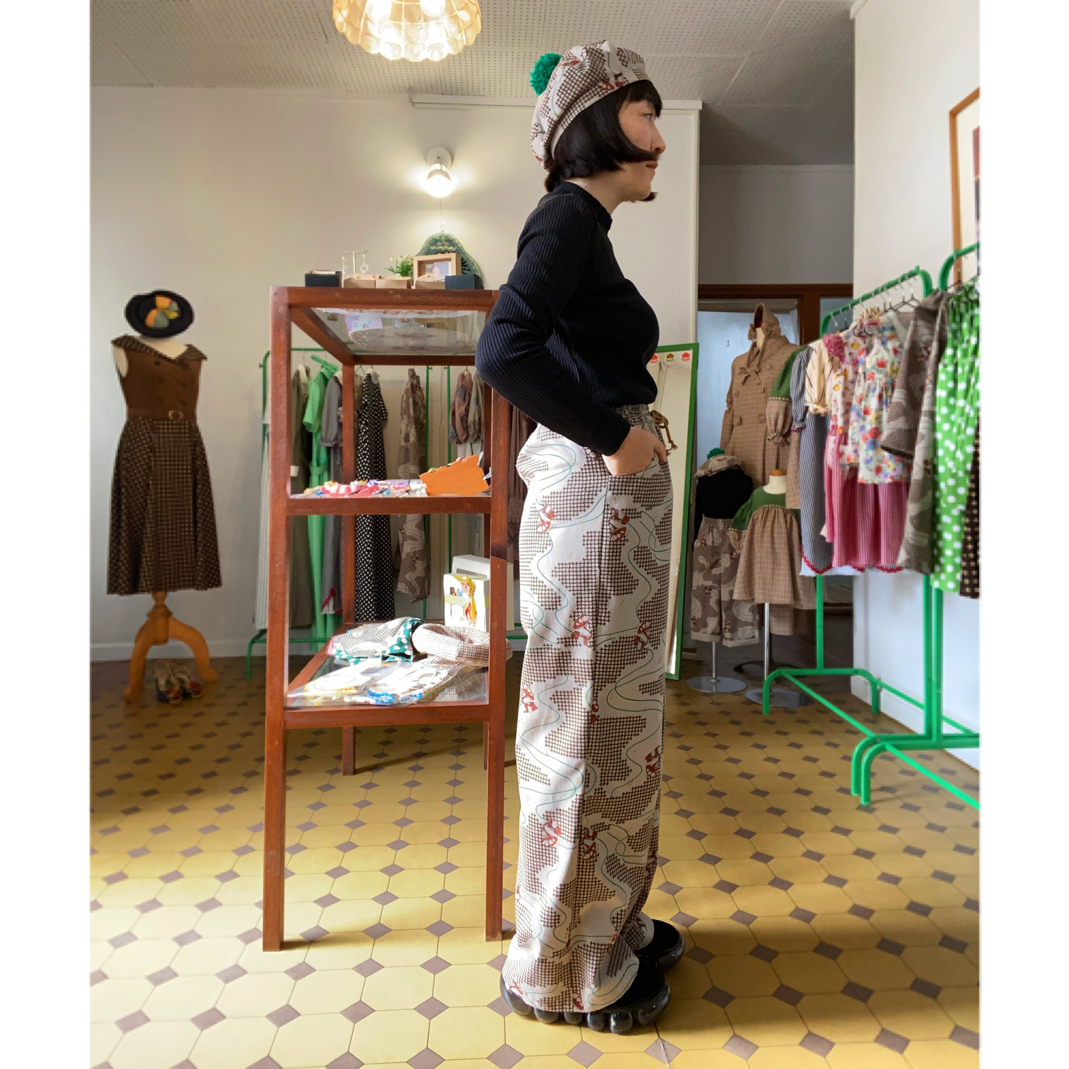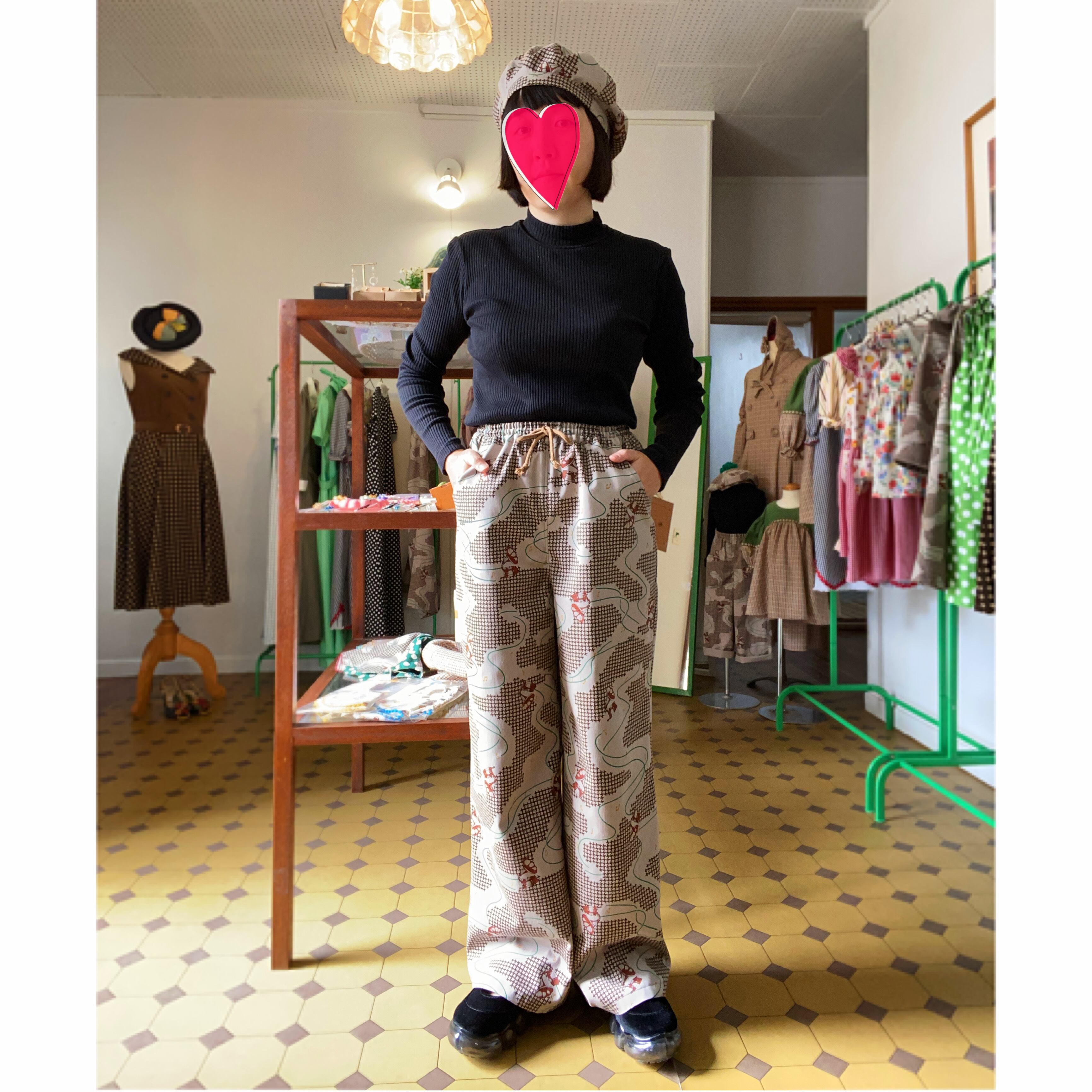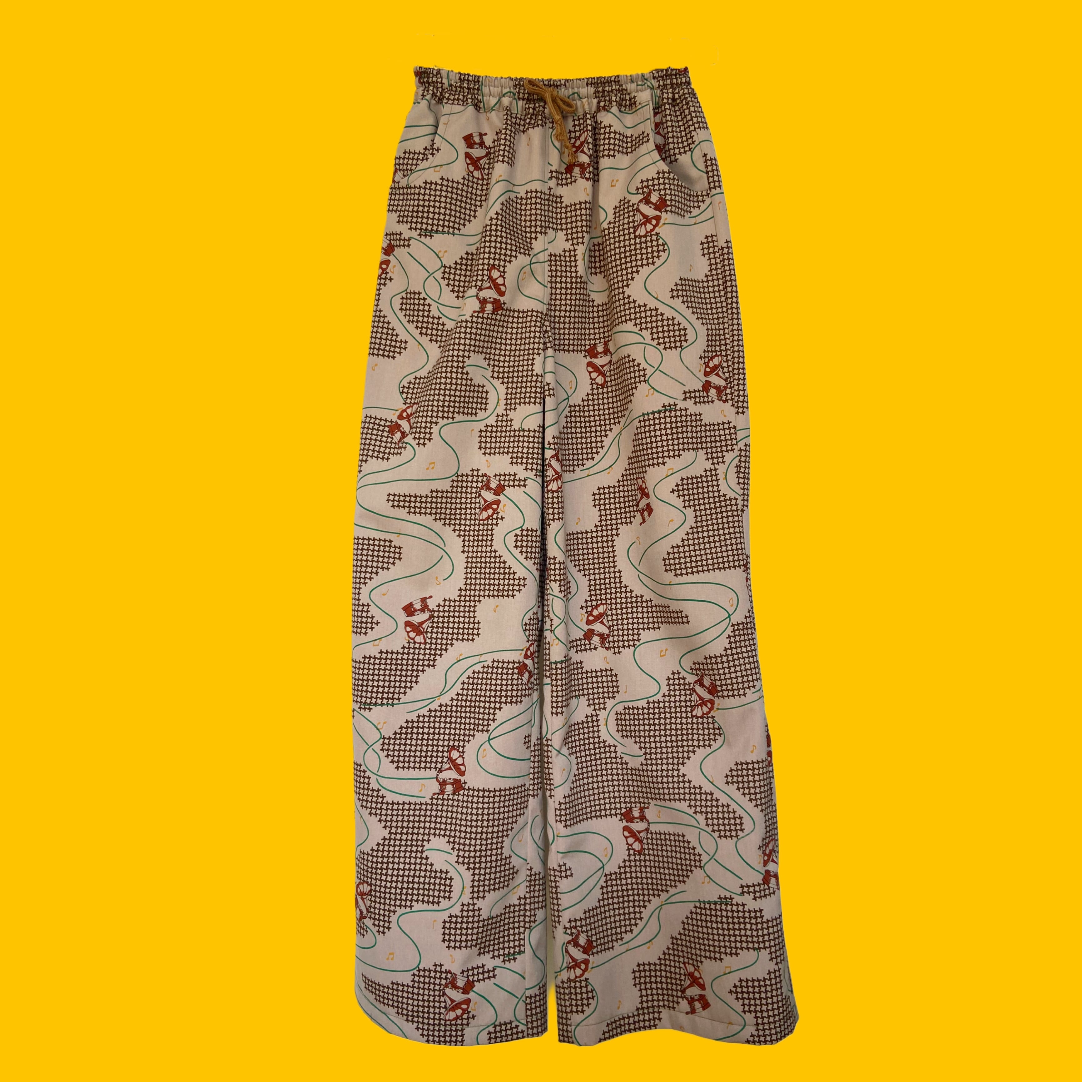 蓄音機柄ワイドパンツL