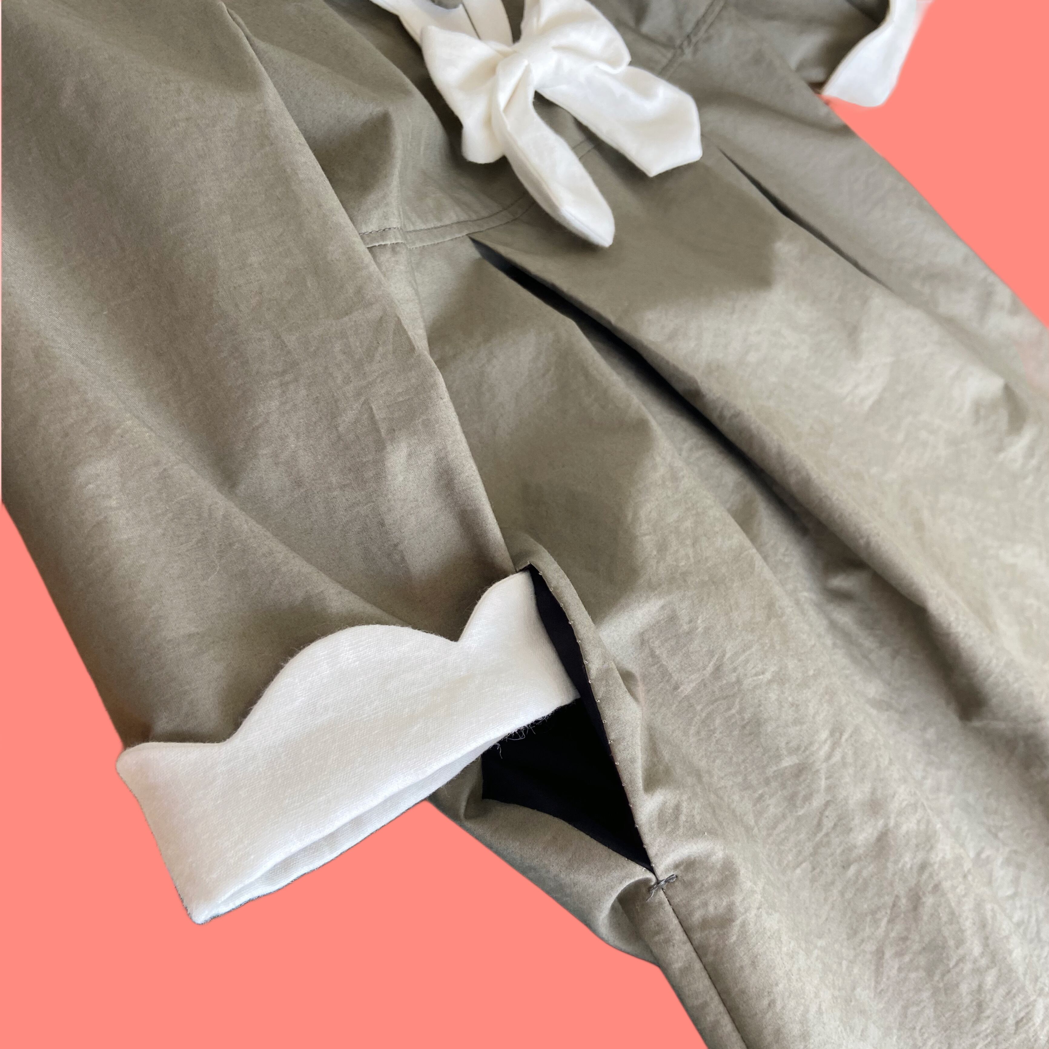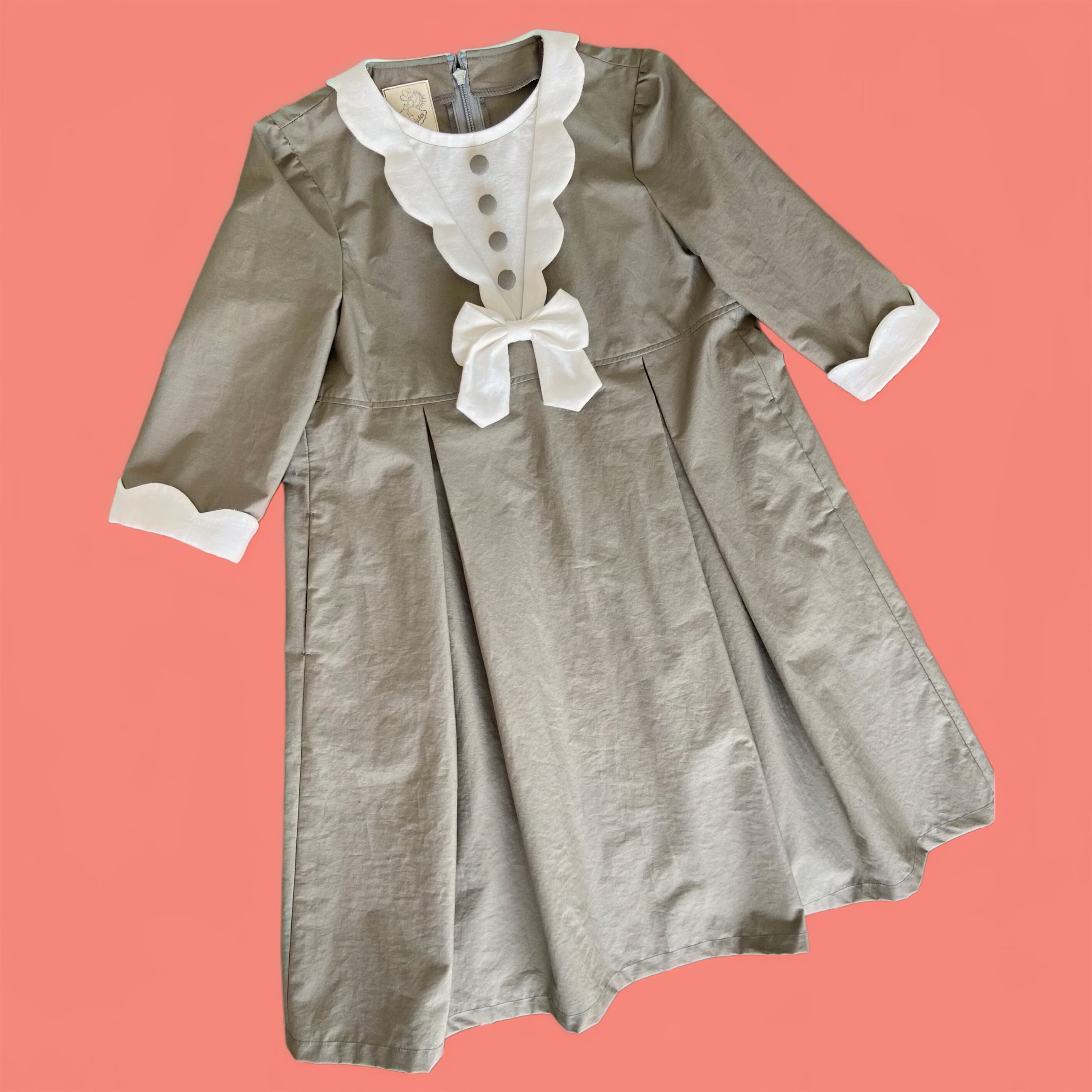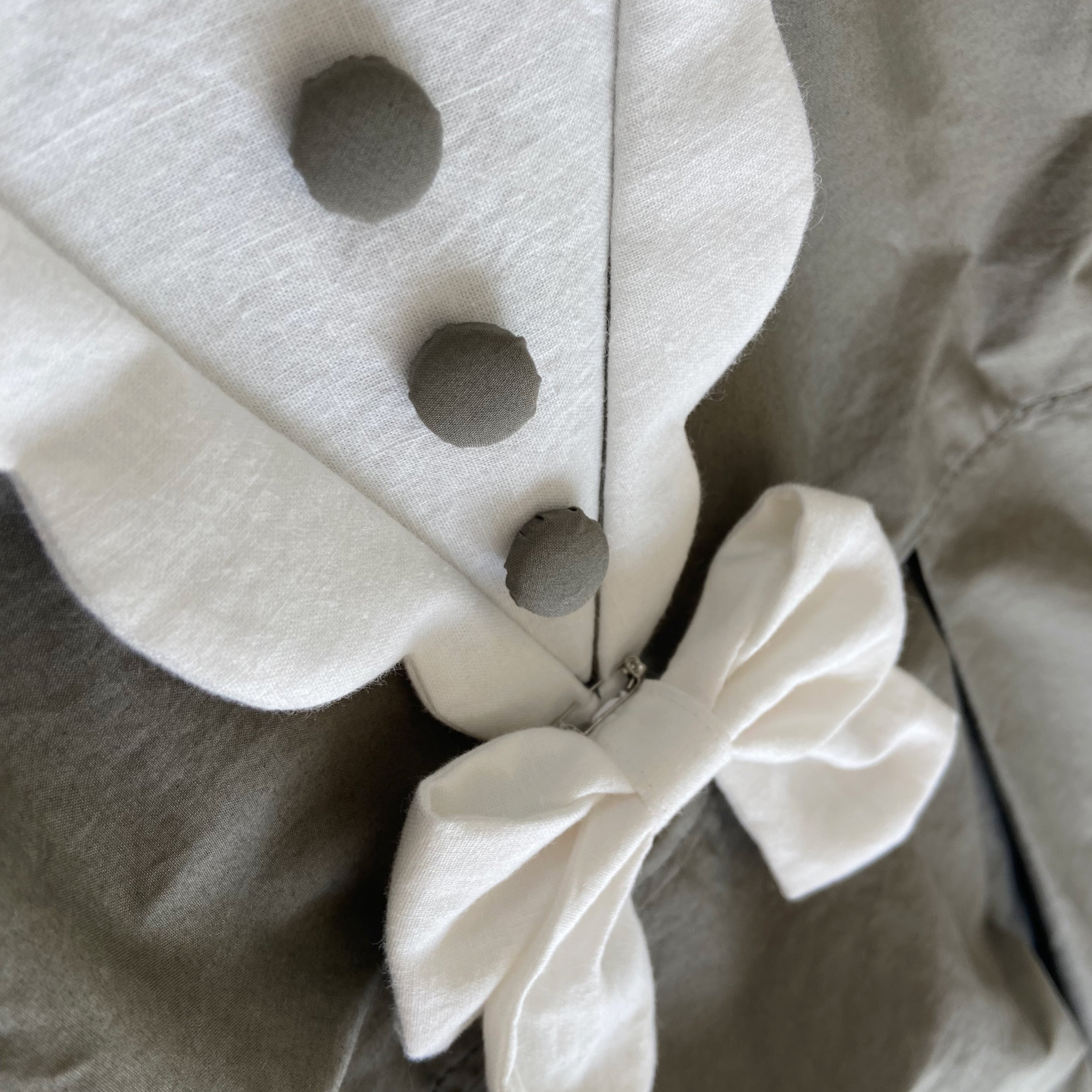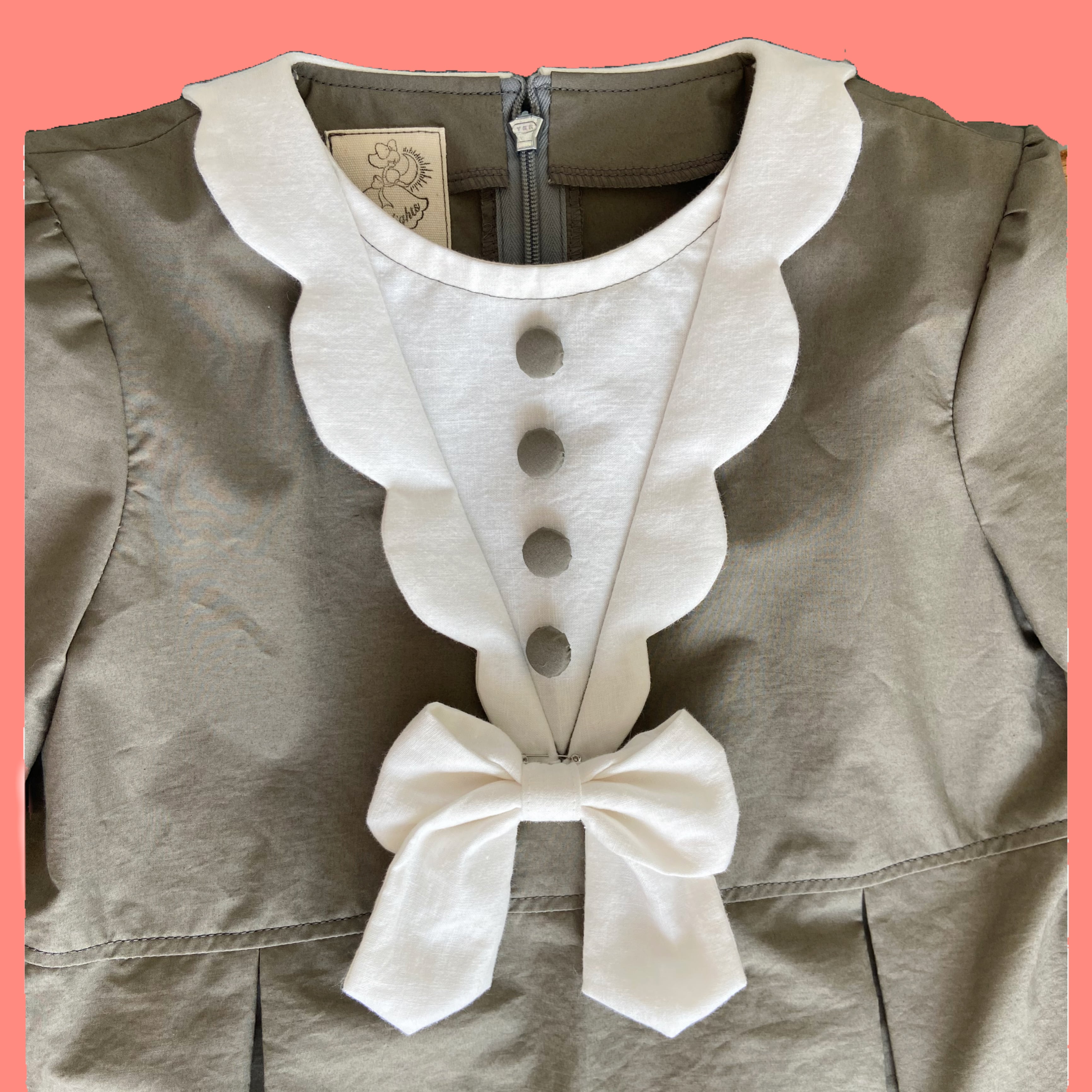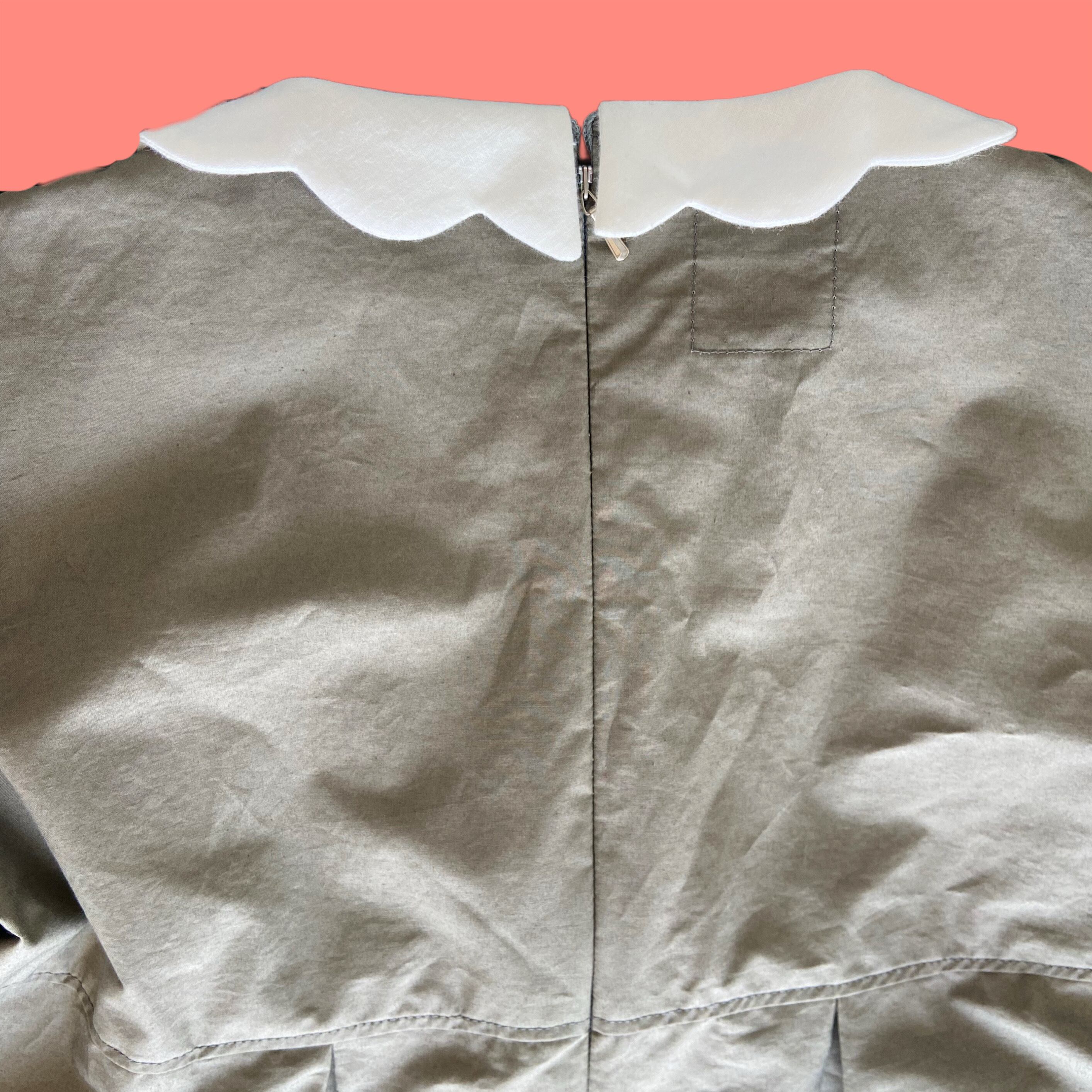 スカラップの襟と袖、胸元のボタン、大きくとったタック等